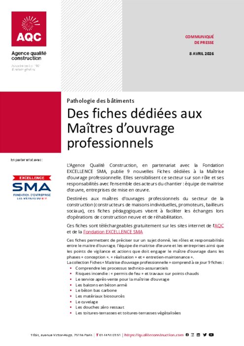 L’Agence Qualité Construction, en partenariat avec la Fondation EXCELLENCE SMA, publie 9 nouvelles Fiches dédiées à la Maîtrise d’ouvrage professionnelle. Elles sensibilisent ce secteur sur son rôle et ses responsabilités avec l’ensemble des acteurs du chantier : équipe de maitrise d’œuvre, entreprises de mise en œuvre.