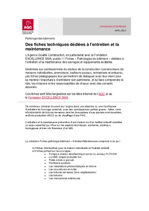 Institutionnels 11 avril 2024 - 14:38 L’Agence Qualité Construction, en partenariat avec la Fondation Excellence SMA, publie onze Fiches « Pathologies du bâtiment » dédiées à l’entretien et la maintenance des ouvrages et équipements existants. PDF (123 Ko) Télécharger Crédits : AQC