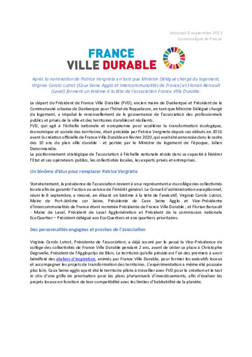 Après la nomination de Patrice Vergriete en tant que Ministre Délégué chargé du logement, Virginie Carolo Lutrot (Caux Seine Agglo et Intercommunalités de France) et Florian Bercault (Laval) forment un binôme à la tête de l’association France Ville Durable.