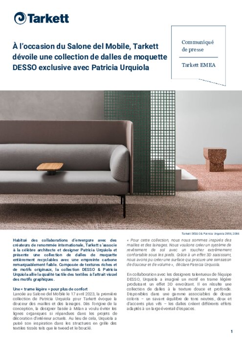 Habitué des collaborations d’envergure avec des créateurs de renommée internationale, Tarkett s’associe à la célèbre architecte et designer Patricia Urquiola et présente une collection de dalles de moquette entièrement recyclables avec une empreinte carbone remarquablement faible. Composée de textures riches et de motifs originaux, la collection DESSO & Patricia Urquiola allie la qualité tactile des textiles à l’attrait visuel des motifs graphiques.