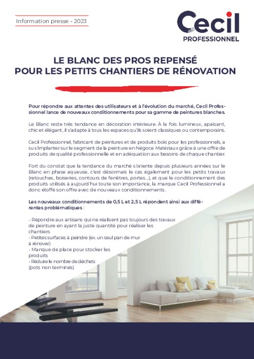 Fort du constat que la tendance du marché s’oriente depuis plusieurs années sur le Blanc en phase aqueuse, c’est désormais le cas également pour les petits travaux (retouches, boiseries, contours de fenêtres, portes…), et que le conditionnement des produits utilisés à aujourd’hui toute son importance, la marque Cecil Professionnel a donc étoffé son offre avec de nouveaux conditionnements.
