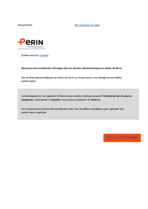 Le shelter Perin est une structure modulaire en béton conçue pour accueillir les équipements photovoltaïques. Il offre une résistance exceptionnelle aux intempéries, incendies et autres agressions extérieures, garantissant ainsi une longévité de 50 ans.