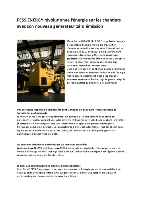PESS Energy, leader français des solutions d'énergie mobile propre, est fier d'annoncer sa participation au salon Intermat, qui se tiendra du 24 au 27 avril 2024 à Paris. L'événement marquera le lancement officiel du tout nouveau