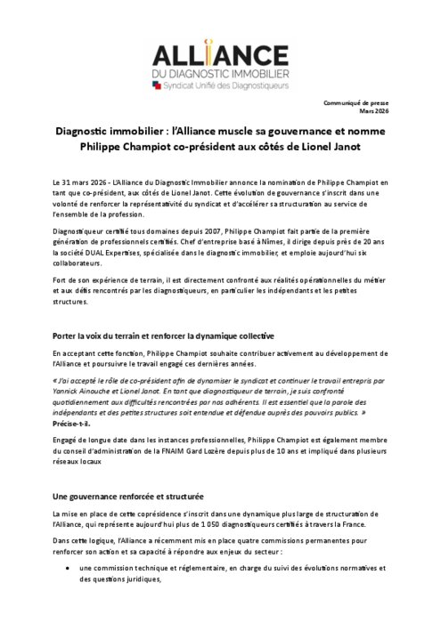 L’Alliance du Diagnostic Immobilier annonce la nomination de Philippe Champiot en tant que co-président, aux côtés de Lionel Janot. Cette évolution de gouvernance s’inscrit dans une volonté de renforcer la représentativité du syndicat et d’accélérer sa structuration au service de l’ensemble de la profession.
