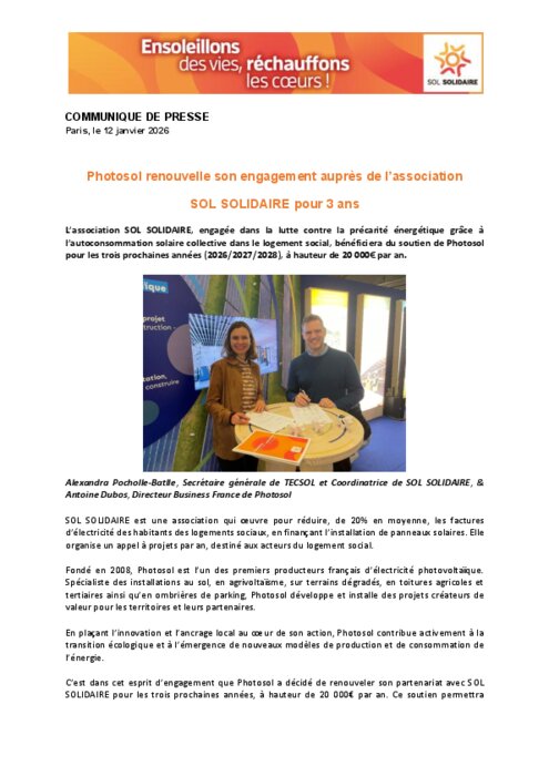 L’association SOL SOLIDAIRE, engagée dans la lutte contre la précarité énergétique grâce à l’autoconsommation solaire collective dans le logement social, bénéficiera du soutien de Photosol pour les trois prochaines années (2026/2027/2028), à hauteur de 20 000€ par an.