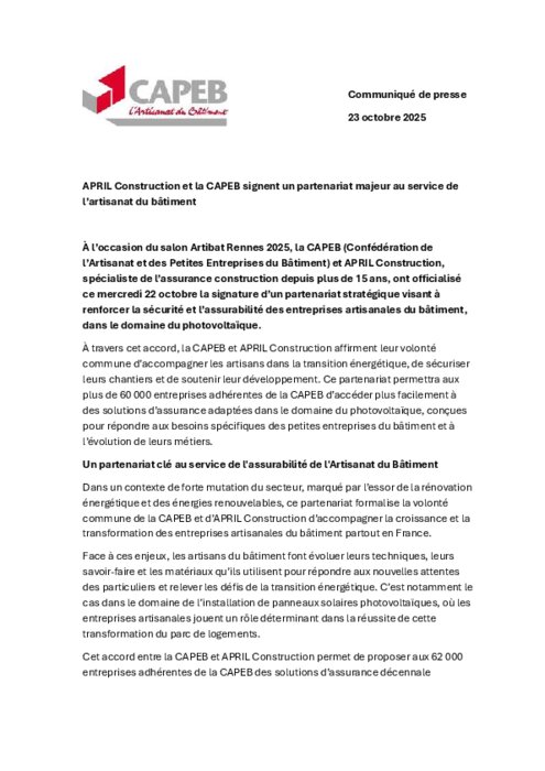 À l’occasion du salon Artibat Rennes 2025, la CAPEB et APRIL Construction, spécialiste de l’assurance construction depuis plus de 15 ans, ont officialisé ce mercredi 22 octobre la signature d’un partenariat stratégique visant à renforcer la sécurité et l’assurabilité des entreprises artisanales du bâtiment, dans le domaine du photovoltaïque.