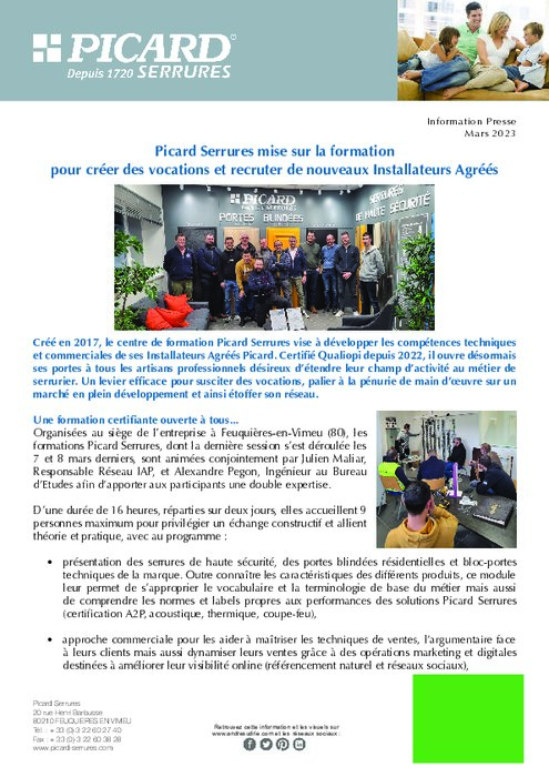 et commerciales de ses Installateurs Agréés Picard. Certifié Qualiopi depuis 2022, il ouvre désormais