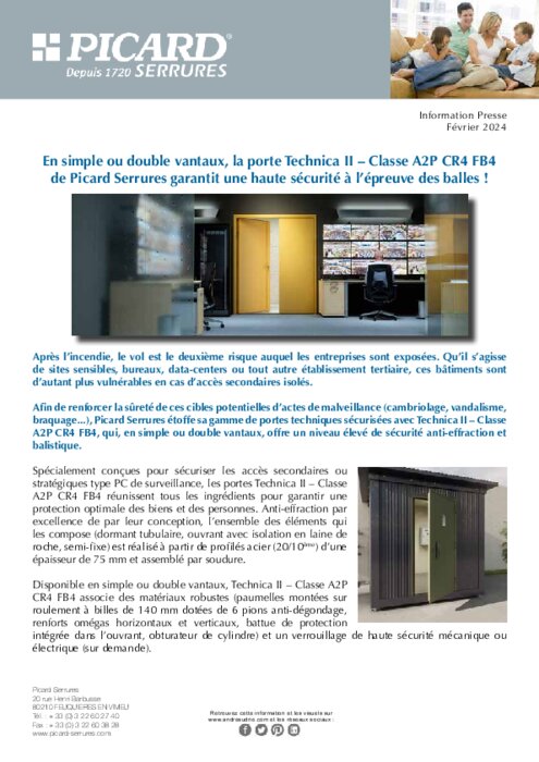 Afin de renforcer la sûreté de ces cibles potentielles d’actes de malveillance (cambriolage, vandalisme, braquage...), Picard Serrures étoffe sa gamme de portes techniques sécurisées avec Technica II – Classe A2P CR4 FB4, qui, en simple ou double vantaux, offre un niveau élevé de sécurité anti-effraction et balistique.