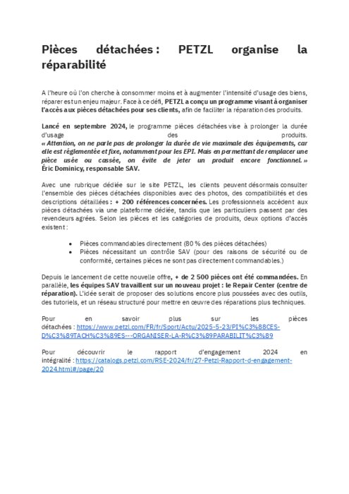 A l’heure où l’on cherche à consommer moins et à augmenter l’intensité d’usage des biens, réparer est un enjeu majeur. Face à ce défi, PETZL a conçu un programme visant à organiser l’accès aux pièces détachées pour ses clients, afin de faciliter la réparation des produits.