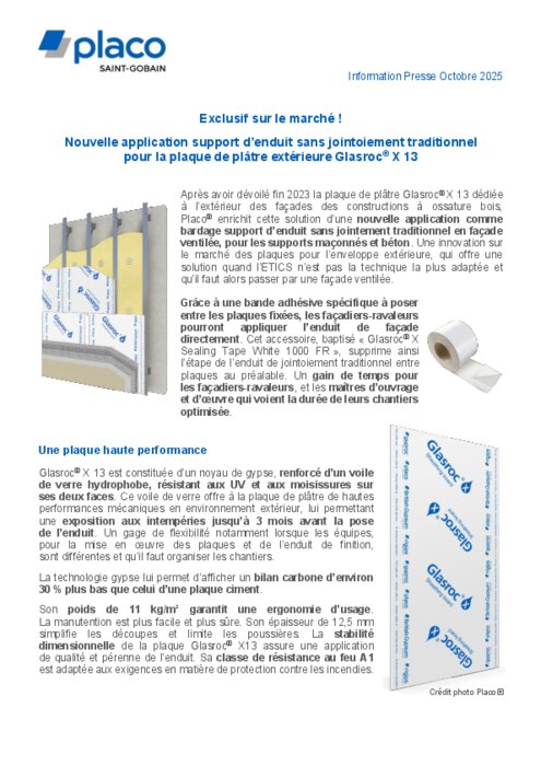 Après avoir dévoilé fin 2023 la plaque de plâtre Glasroc X 13 dédiée à l’extérieur des façades des constructions à ossature bois, Placo enrichit cette solution d’une nouvelle application comme bardage support d’enduit sans jointement traditionnel en façade ventilée, pour les supports maçonnés et béton. Une innovation sur le marché des plaques pour l’enveloppe extérieure, qui offre une solution quand l’ETICS n’est pas la technique la plus adaptée et qu’il faut alors passer par une façade ventilée.