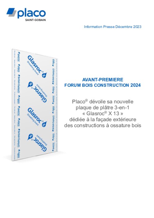 Poursuivant son engagement pour accompagner le développement de la construction bois en France, Placo lance la plaque Glasroc X 13, un produit de rupture destiné aux façades et à l’enveloppe extérieure. A l’occasion du prochain