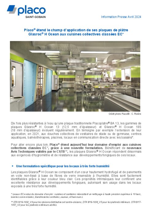 Industriels 24 avril 2024 - 10:00 Placo étend aujourd’hui leur domaine d’emploi aux cuisines collectives classées EC, grâce à une nouvelle formulation. Bénéficiant de nouveaux Avis Techniques validés par le CSTB**, les plaques Glasroc H Ocean. PDF (473 Ko) Télécharger