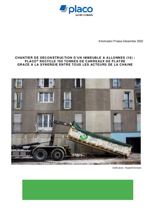 L’identification, la récupération et le recyclage des carreaux de plâtre présents en masse dans ce bâtiment des années 60 distinguent cette démarche. Après leur diagnostic qui identifiait 750 tonnes, AD-INGE a rédigé un cahier des charges imposant un objectif de 50 % de recyclage. L’entreprise de démolition Occamat, capable d’atteindre 75 %, soit 525 tonnes de déchets recyclés, a été retenue. A la fin du chantier, ce sont finalement 700 tonnes de carreaux de plâtre qui ont été recyclées.