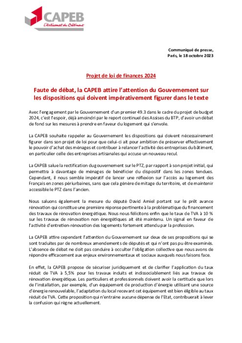 La CAPEB souhaite rappeler au Gouvernement les dispositions qui doivent nécessairement figurer dans son projet de loi pour que celui-ci ait pour ambition de préserver effectivement le pouvoir d’achat des ménages et contribuer à relancer l’activité des entreprises du bâtiment, en particulier celle des entreprises artisanales qui accuse un nouveau recul.