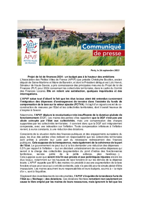 L’APVF salue tout d’abord le fait que les élus locaux aient été entendus concernant l’intégration des dépenses d’aménagement de terrains dans l’assiette du fonds de compensation de la taxe sur la valeur ajoutée (FCTVA). Il s’agit d’un signal concret de co-construction de mesures par l’Etat et les collectivités territoriales, dont il serait heureux de s’inspirer à l’avenir. Néanmoins, l’APVF déplore la revalorisation très insuffisante de la dotation globale de fonctionnement (DGF).