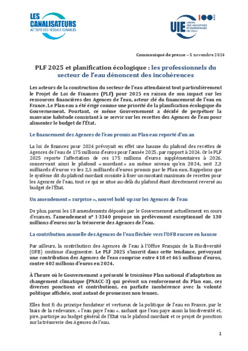 Les acteurs de la construction du secteur de l’eau attendaient tout particulièrement le Projet de loi de finances (PLF) pour 2025 en raison de son impact sur les ressources financières des Agences de l’eau. Le Plan eau a été érigé comme une priorité de la planification écologique du gouvernement. Pourtant, ce même gouvernement a décidé de perpétuer la mauvaise habitude consistant à se servir sur les recettes des Agences de l’eau pour alimenter le budget de l’État.