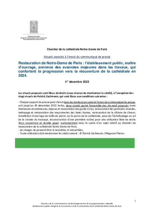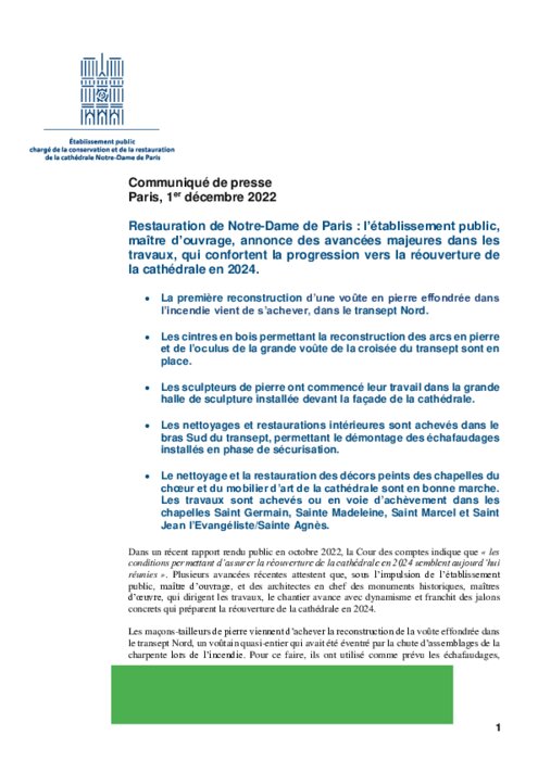 Dans un récent rapport rendu public en octobre 2022, la Cour des comptes indique que « les conditions permettant d’assurer la réouverture de la cathédrale en 2024 semblent aujourd’hui réunies ». Plusieurs avancées récentes attestent que, sous l’impulsion de l’établissement public, maître d’ouvrage, et des architectes en chef des monuments historiques, maîtres d’œuvre, qui dirigent les travaux, le chantier avance avec dynamisme et franchit des jalons concrets qui préparent à la réouverture.
