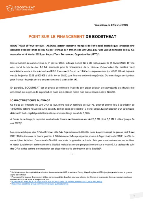 Boostheat, acteur industriel français de l'efficacité énergétique, annonce une nouvelle levée de fonds de 500 K€ par le tirage de 1 tranche de 200 ORA, pour une valeur nominale de 500 K€, souscrite le 14 février 2023 par Impact Tech Turnaround Opportunities (ITTO).