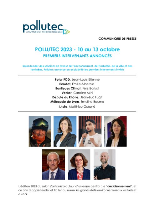 Institutionnels 29 juin 2023 - 09:25 Salon leader des solutions en faveur de l'environnement, de l'industrie, de la ville et des territoires, Pollutec annonce en exclusivité les premiers intervenants invités. PDF (4 Mo) Télécharger