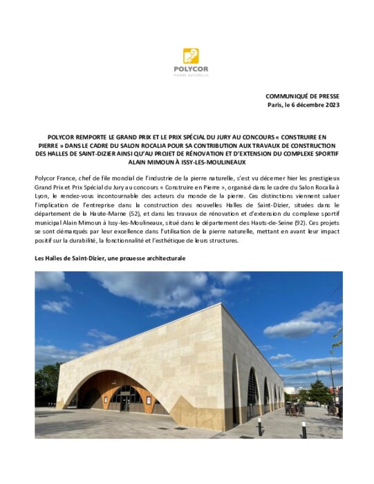 Polycor France, chef de file mondial de l’industrie de la pierre naturelle, s’est vu décerner hier les prestigieux Grand Prix et Prix Spécial du Jury au concours « Construire en Pierre », organisé dans le cadre du Salon Rocalia à Lyon, le rendez-vous incontournable des acteurs du monde de la pierre.