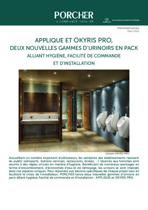 Bénéficiant de nombreux avantages en terme d’encombrement, d’économies d’eau et de nettoyage, les urinoirs se sont imposés dans ces espaces uniques. Pour répondre aux besoins spécifiques de chaque projet tout en facilitant le choix de l’installateur, Porcher lance deux nouvelles gammes d’urinoirs en pack alliant hygiène, facilité de commande et d’installation : Applique et Okyris Pro.