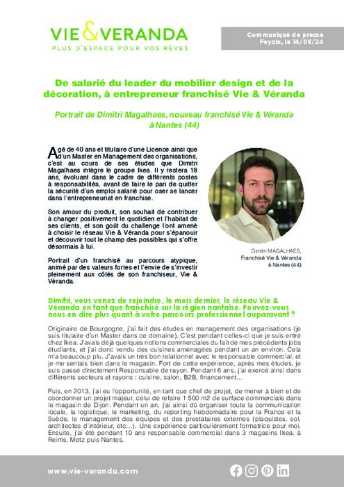 Industriels 14 juin 2024 - 10:38 Portrait d’un franchisé au parcours atypique, animé par des valeurs fortes et l’envie de s’investir pleinement aux côtés de son franchiseur, Vie & Véranda. PDF (203 Ko) Télécharger