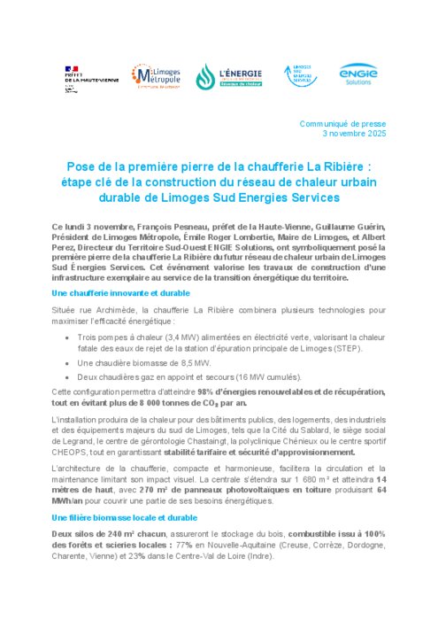 La chaufferie La Ribière combinera plusieurs technologies pour maximiser l’efficacité énergétique : trois pompes à chaleur (3,4 MW) alimentées en électricité verte, une chaudière biomasse de 8,5 MW et deux chaudières gaz en appoint et secours (16 MW cumulés). Cette configuration permettra d’atteindre 98% d’énergies renouvelables et de récupération, tout en évitant plus de 8 000 tonnes de CO₂ par an. L’installation produira de la chaleur pour des bâtiments publics, des logements, des industriels et des équipements majeurs du sud de Limoges, tout en garantissant stabilité tarifaire et sécurité d’approvisionnement.