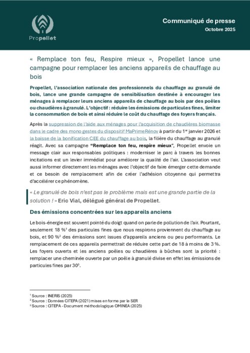 Propellet a lancé une grande campagne de sensibilisation destinée à encourager les ménages à remplacer leurs anciens appareils de chauffage au bois par des poêles ou chaudières à granulé. L’objectif : réduire les émissions de particules fines, limiter la consommation de bois et ainsi réduire le coût du chauffage des foyers français.