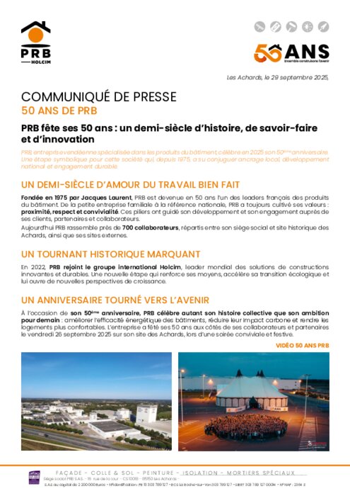 Distributeurs 07 octobre 2025 - 15:40 PRB, entreprise vendéenne spécialisée dans les produits du bâtiment, célèbre en 2025 son 50e anniversaire. Une étape symbolique pour cette société qui, depuis 1975, a su conjuguer ancrage local, développement national et engagement durable. PDF (2 Mo) Télécharger