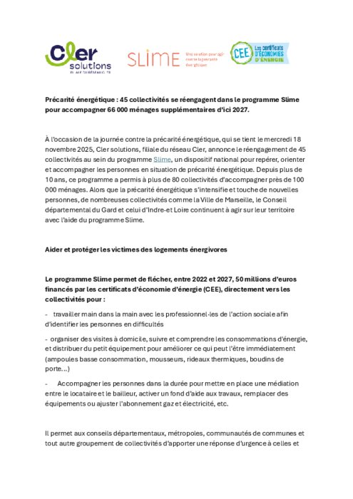 À l’occasion de la journée contre la précarité énergétique, qui se tient le 18 novembre, Cler solutions, filiale du réseau Cler, annonce le réengagement de 45 collectivités au sein du programme Slime, un dispositif national pour repérer, orienter et accompagner les personnes en situation de précarité énergétique. Depuis plus de 10 ans, ce programme a permis à plus de 80 collectivités d’accompagner près de 100 000 ménages.