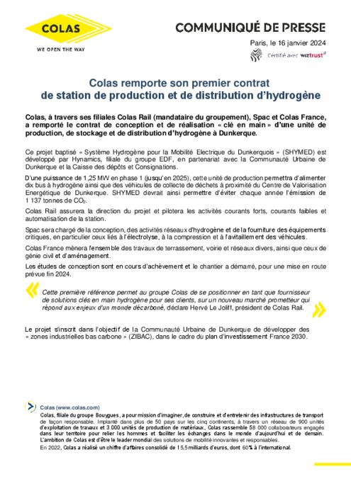 Colas, à travers ses filiales Colas Rail (mandataire du groupement), Spac et Colas France, a remporté le contrat de conception et de réalisation « clé en main » d’une unité de production, de stockage et de distribution d’hydrogène à Dunkerque.
