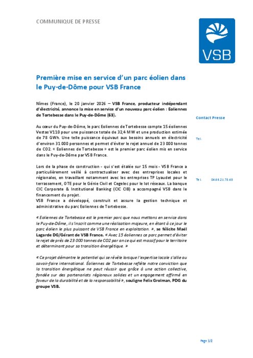 Au cœur du Puy-de-Dôme, le parc Eoliennes de Tortebesse compte 15 éoliennes Vestas V110 pour une puissance totale de 32,4 MW et une production estimée de 78 GWh. Une telle puissance équivaut aux besoins annuels en électricité d’environ 31 000 personnes et permet d’éviter le rejet annuel de 23 000 tonnes de CO2. « Eoliennes de Tortebesse » est le premier parc éolien mis en service dans le Puy-de-Dôme par VSB France.
