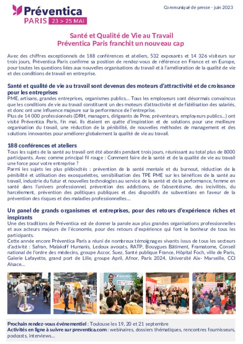 Avec des chiffres exceptionnels de 188 conférences et ateliers, 532 exposants et 14 326 visiteurs sur trois jours, Préventica Paris confirme sa position de rendez-vous de référence en France et en Europe, pour toutes les questions liées aux nouvelles organisations du travail et à l’amélioration de la qualité de vie et des conditions de travail en entreprise.