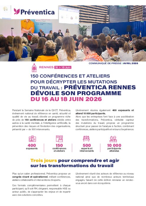 Pendant la Semaine nationale de la QVCT, Préventica, événement national de référence en santé, sécurité et qualité de vie au travail, dévoile un programme riche de près de 150 conférences et ateliers dédiés entre autres à la santé mentale, à l’intelligence artificielle, la