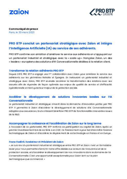 PRO BTP confirme son ambition d’améliorer le service aux adhérents en s’appuyant sur un partenariat industriel et stratégique avec la « scale-up » française Zaion, un des « leaders » européens des solutions d’IA Conversationnelle dédiées à la relation client.