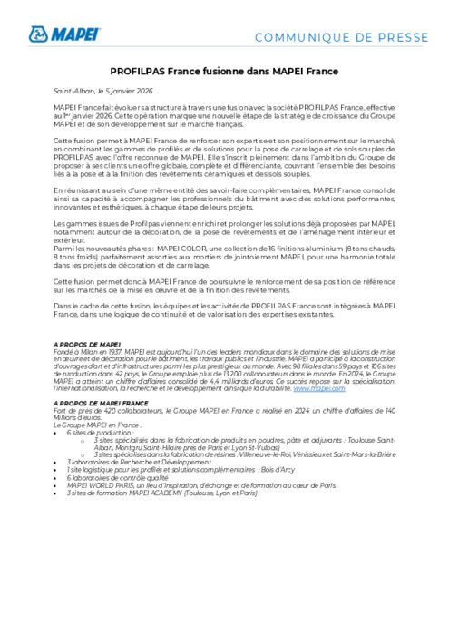 MAPEI France fait évoluer sa structure à travers une fusion avec la société PROFILPAS France, effective au 1er janvier 2026. Cette opération marque une nouvelle étape de la stratégie de croissance du Groupe MAPEI et de son développement sur le marché français. Cette fusion permet à MAPEI France de renforcer son expertise et son positionnement sur le marché, en combinant les gammes de profilés et de solutions pour la pose de carrelage et de sols souples de PROFILPAS avec l’offre reconnue de MAPEI. Elle s’inscrit pleinement dans l’ambition du Groupe de proposer à ses clients une offre globale, complète et différenciante, couvrant l’ensemble des besoins liés à la pose et à la finition des revêtements céramiques et des sols souples.