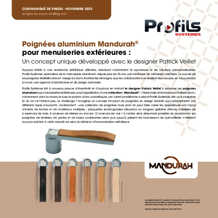 Industriels 16 novembre 2023 - 10:36 Profils Systèmes fait à nouveau preuve d’inventivité et d’audace en invitant le designer Patrick Veillet à repenser ses poignées aluminium pour menuiseries extérieures, sous l’appellation d’une collection : Mandurah. PDF (856 Ko) Télécharger