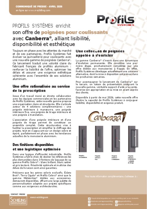 Toujours en phase avec les attentes du marché et de ses partenaires, Profils Systèmes fait évoluer sa quincaillerie pour coulissants avec une nouvelle gamme de poignées Canberra. Ce lancement traduit une volonté claire du fabricant français de profilés aluminium : renforcer la lisibilité de l’offre, optimiser les délais et assurer une exigence esthétique cohérente avec l’ensemble de ses solutions aluminium.