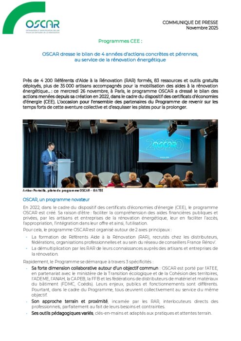 Près de 4 200 Référents d’Aide à la Rénovation (RAR) formés, 83 ressources et outils gratuits déployés, plus de 35 000 artisans accompagnés pour la mobilisation des aides à la rénovation énergétique... : ce mercredi 26 novembre, à Paris, le programme OSCAR a dressé le bilan des actions menées depuis sa création en 2022, dans le cadre du dispositif des certificats d’économies d’énergie (CEE).