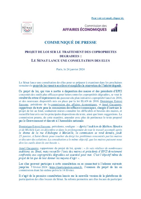 Institutionnels 24 janvier 2024 - 15:58 Le Sénat lance une consultation des élus pour se préparer à examiner dans les prochaines semaines le projet de loi visant à accélérer et simplifier la rénovation de l’habitat dégradé. PDF (137 Ko) Télécharger