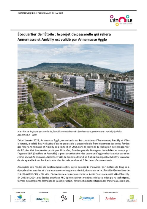Début Janvier 2023, Annemasse Agglo, en accord avec les communes d’Annemasse, Ambilly et Villela-Grand, a validé l’AVP (études d’avant-projet) de la passerelle de franchissement des voies ferrées qui reliera Annemasse et Ambilly au plus tard en 2026 dans le cadre de la réalisation de l’écoquartier de l’Étoile.