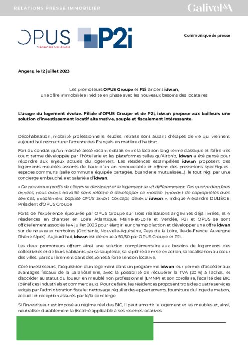 L’usage du logement évolue. Filiale d’OPUS Groupe et de P2i, idwan propose aux bailleurs une solution d’investissement locatif alternative, souple et fiscalement intéressante. Décohabitation, mobilité professionnelle, études, retraite sont autant d’étapes de vie qui viennent aujourd’hui restructurer l’attente des Français en matière d’habitat.