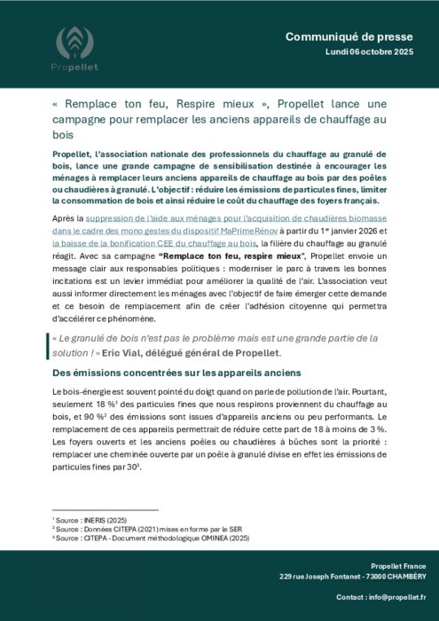 Propellet, l’association nationale des professionnels du chauffage au granulé de bois, lance une grande campagne de sensibilisation destinée à encourager les ménages à remplacer leurs anciens appareils de chauffage au bois par des poêles ou chaudières à granulé. L’objectif : réduire les émissions de particules fines, limiter la consommation de bois et ainsi réduire le coût du chauffage des foyers français.