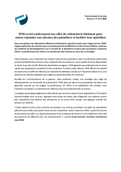 Avec une gamme de robinetterie bâtiment entièrement repensée à partir des usages terrain, PUM, négoce spécialiste de solutions pour les professionnels du Bâtiment et des Travaux Publics, confirme son ambition de développement sur le marché de la plomberie et place plus que jamais l’expertise métier, la performance de l’offre et la satisfaction des artisans au cœur de sa stratégie.