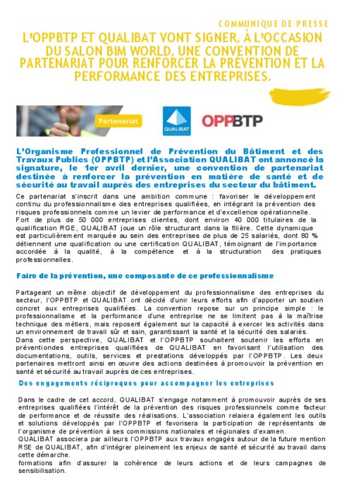 Le 1er avril dernier, lors du salon BIM WORLD, L’Organisme Professionnel de Prévention du Bâtiment et des Travaux Publics (OPPBTP) et l’Association QUALIBAT ont signé une convention de partenariat destinée à renforcer la prévention en matière de santé et de sécurité au travail auprès des entreprises du secteur du bâtiment.