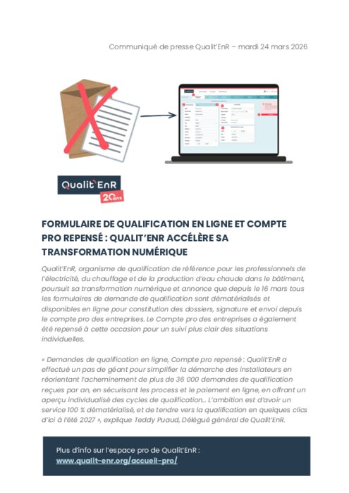Qualit’EnR, organisme de qualification de référence pour les professionnels de l’électricité, du chauffage et de la production d’eau chaude dans le bâtiment, poursuit sa transformation numérique et annonce que depuis le 16 mars tous les formulaires de demande de qualification sont dématérialisés et disponibles en ligne pour constitution des dossiers, signature et envoi depuis le compte pro des entreprises. Le Compte pro des entreprises a également été repensé à cette occasion pour un suivi plus clair des situations individuelles.