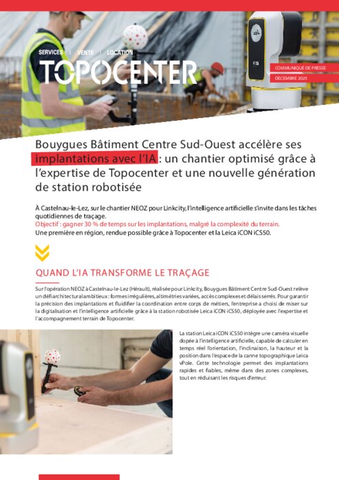 Sur le projet NEOZ à Castelnau-le-Lez, Bouygues Bâtiment Centre Sud-Ouest a déployé la station robotisée Leica iCON iCS50 de Topocenter. Cette technologie révolutionne le traçage : orientation et position calculées en temps réel, gain de 30 % sur les implantations et une précision millimétrée, ergonomie simplifiée et autonomie totale de la personne