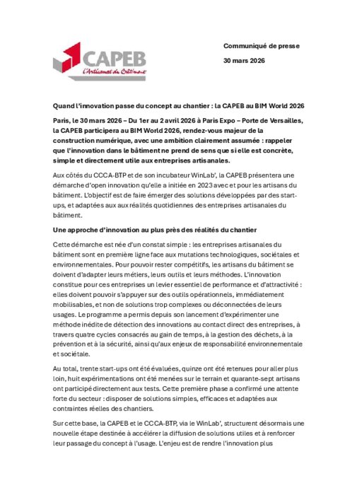 Du 1er au 2 avril à Paris Expo – Porte de Versailles, la CAPEB participera au BIM World 2026, rendez-vous majeur de la construction numérique, avec une ambition clairement assumée : rappeler que l’innovation dans le bâtiment ne prend de sens que si elle est concrète, simple et directement utile aux entreprises artisanales.