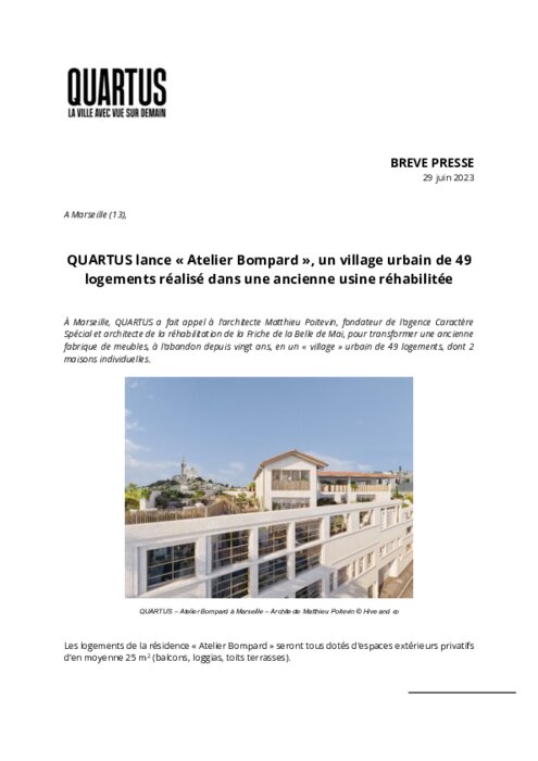À Marseille, QUARTUS a fait appel à l’architecte Matthieu Poitevin, fondateur de l’agence Caractère Spécial et architecte de la réhabilitation de la Friche de la Belle de Mai, pour transformer une ancienne fabrique de meubles, à l’abandon depuis vingt ans, en un « village » urbain de 49 logements, dont 2 maisons individuelles.