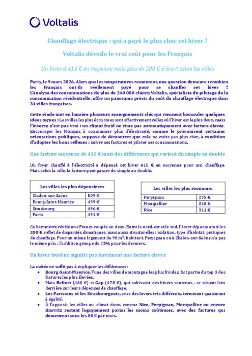 L’analyse des consommations de plus de 240 000 clients Voltalis, spécialiste du pilotage de la consommation résidentielle, offre un panorama précis du coût du chauffage électrique dans 34 villes françaises. Cette étude met en lumière plusieurs enseignements clés qui viennent bousculer quelques idées reçues : Les villes les plus économes sont effectivement celles où l’hiver est le plus doux, mais l’inverse n’est pas vrai : un climat froid ne rime pas automatiquement avec facture élevée.